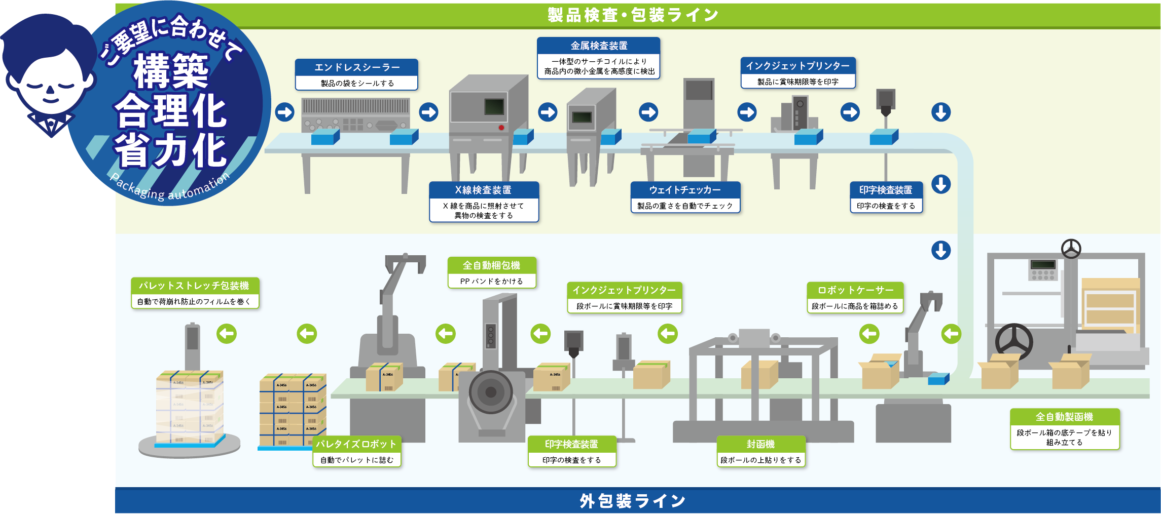 梱包機・製函機・封函機・検査機器・包装機・冷凍、冷蔵機器・シール機・物流機器・食品機械、機器・印字表示システム(産業用インクジェットプリンタ)、他